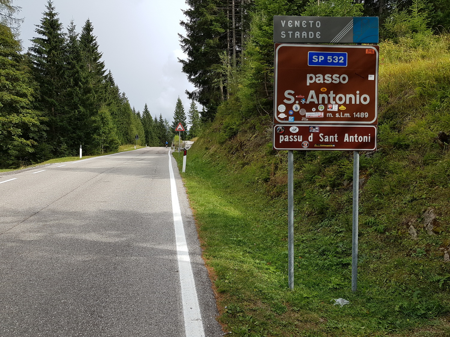 Heute freuen wir uns am warmen und kaum windigen Wetter. Die Straßen sind überwiegend gut. Anfangs geht es durch schöne Mischwälder. Bereits nach ca. 2 km beginnt im Ort Gosaldo die Anfahrt zum Passo Cereda. Nach kurzer Strecke kündigt ein Schild 15 % Steigung an, aber diese Steigung wird nur kurz befahren, und bereits nach 1 km flacht die Straße wieder ab. Es geht dann 1 km leicht ansteigend weiter, bevor eine knapp 3 km lange Abfahrt folgt. Dabei wird die Grenze zwischen Veneto und Trentino-Südtirol passiert. Nach zwei kleineren Dörfern erreichen wir Mis, und damit beginnt der Schlussanstieg zur Passhöhe. Etwa 3 steile Kilometer stehen an, mehrfach wird die Zehn-Prozent-Steigungs-Marke überschritten. Nach 5 km durchfährt man zwei Kehren, die zum Teil in den Fels gesprengt sind. Die letzte Strecke geht über weite Almwiesen, wobei wir einen schönen Blick auf die Belluneser Dolomiten im Süden und den Abbruch der Pale di San Martino im Norden werfen können. Zum Pass hin flacht die Straße ab, und nach 8 km erreichen wir die Hotels auf 1.369 m.