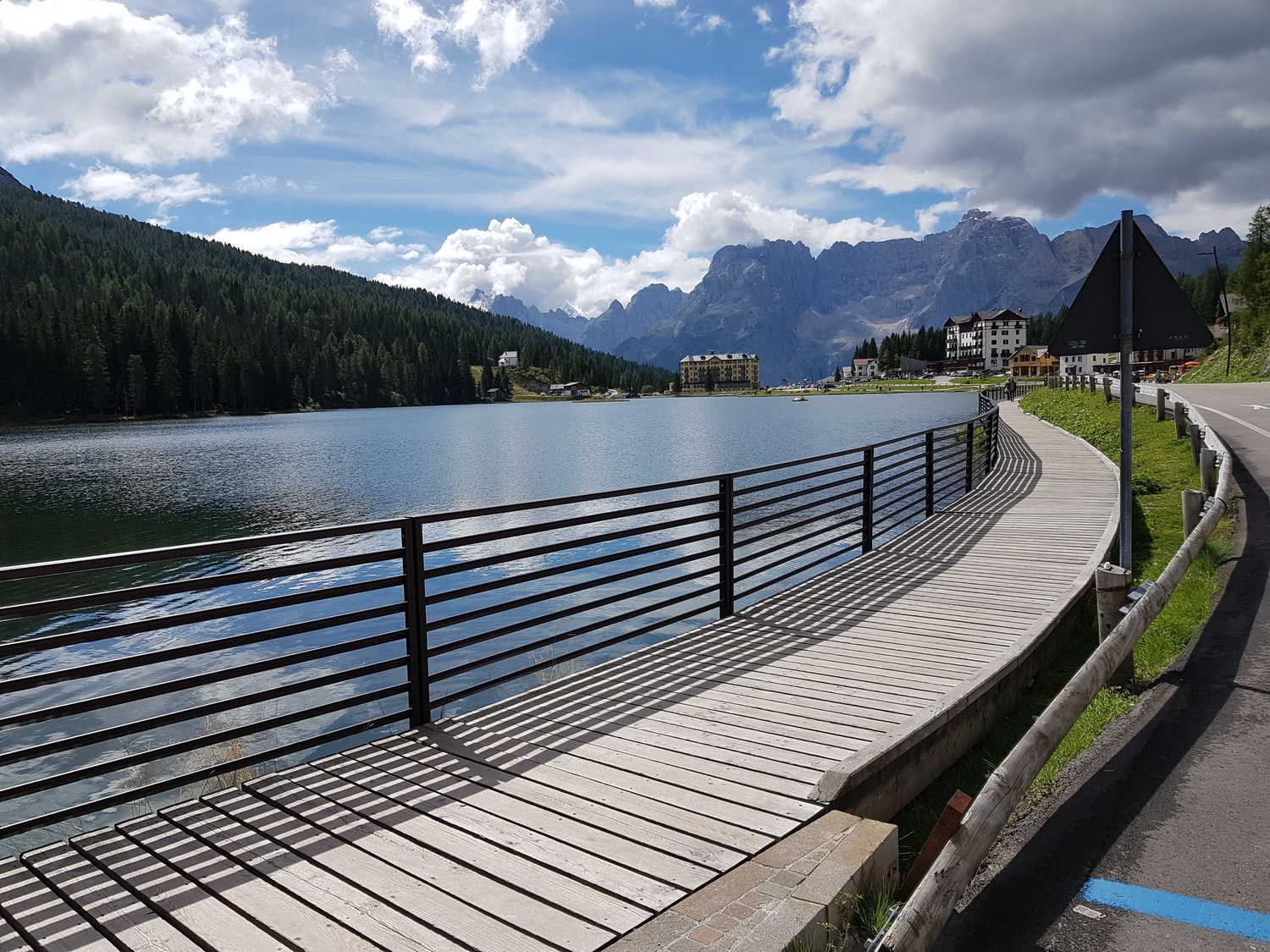Der Anfang der Strecke ist gut zu fahren. Nach ca. 15 km geht es steiler aufwärts, sogar bis 15%, zum Passo di Misurina (1.757 m). Um die Schönheit der Region zu betrachten, machen wir oben eine kurze Pause. Gleich danach verlassen wir Venetien und kommen nach Trentino – Südtirol. Es geht dann abwärts, wo wir nach 37 km etwa 3 km rechts abbiegen zum Lago di Landro (1.406 m). Hier bietet sich uns ein schöner Blick auf die Drei Zinnen. Danach geht es die wenigen Kilometer zurück an die Kreuzung, wo wir 20 km auf „buckliger Strecke“ leicht aufwärts fahren, bevor es abwärts nach Cortina d’Ampezzo, geht.