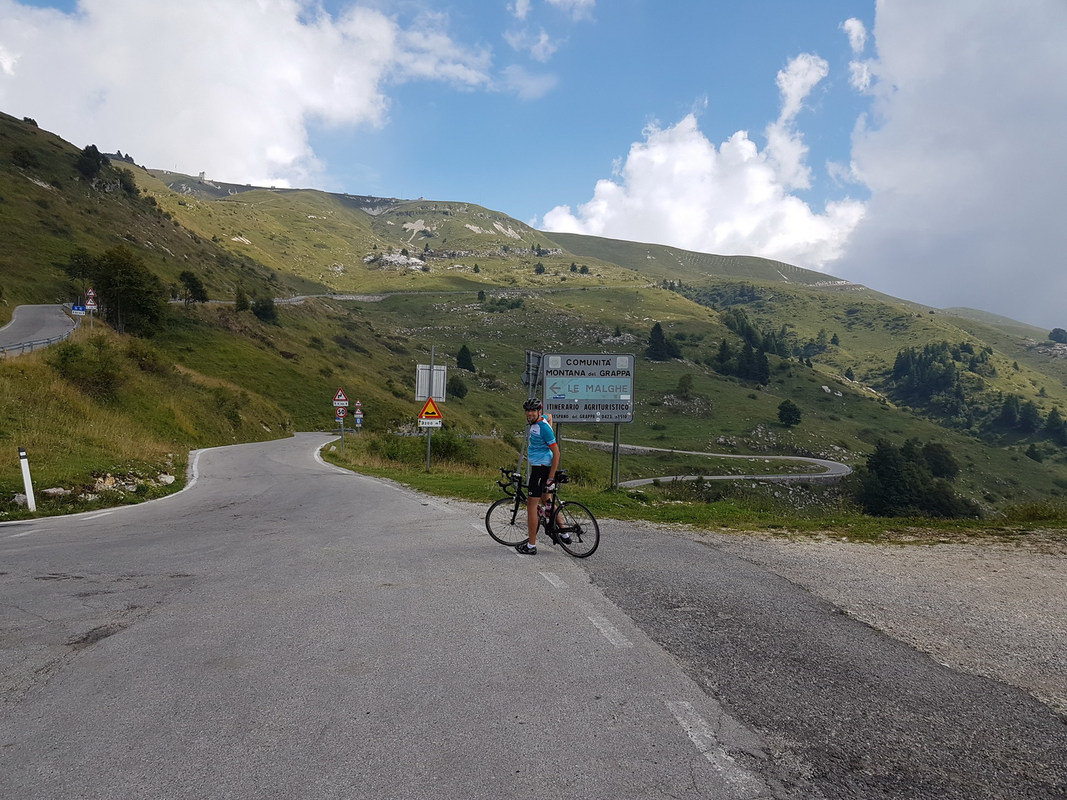 Nach ca. 10 km geht es ab Serèn del Grappa hinauf zum Col di Baio (1.205 m). Bei Kilometer 35 und nach bis zu 17% Steigung sind wir auf dem Monte Grappa (1.775 m). Ich habe gelesen, dass es neun Auffahrten zum Monte Grappa geben soll, die mit Höhenunterschieden von mindestens 1500 Höhenmetern aufwarten. Wir fahren die schönste, jedoch schwerste Strecke, die versteckte rampenhafte Nordauffahrt von Serèn del Grappa. Das vorgelagerte Gebirgsmassiv des Monte Grappa bildet den südlichen Abschluss der Dolomiten vor der venezianischen Ebene.