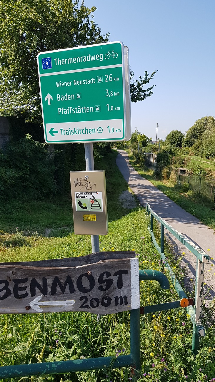 Bereits um 9.30 Uhr starte ich mit dem Rennrad die Tour 1. Vom Wiener Becken aus (295 m) geht es in die Ostalpen von Niederösterreich in die Steiermark. Viel problemloser als ich angenommen habe, kann ich den Großraum Wien verlassen. Insgesamt fahre ich etwa die Hälfte des Tages auf Radwegen.