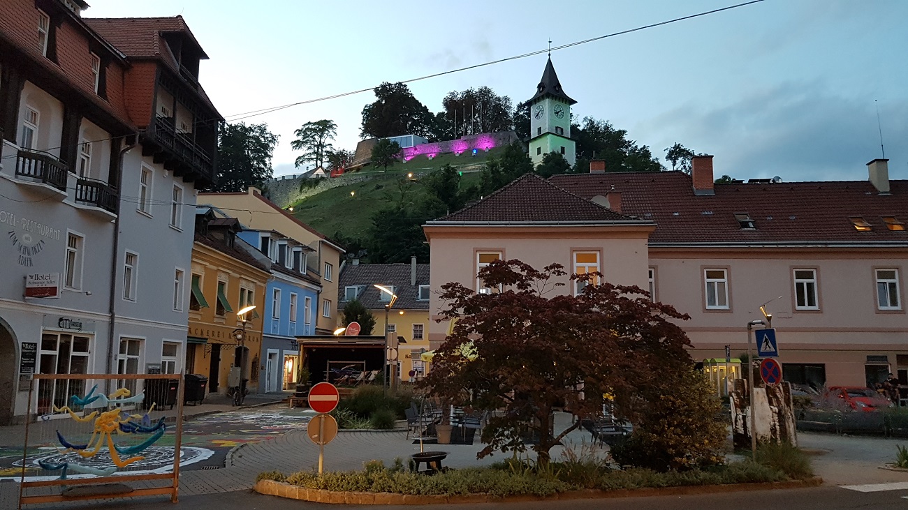 Klaus fährt über die Autobahn zum Tagesziel Bruck an der Mur (16 Tsd. Einw., 491 m), während ich noch ca. 60 km fahren muss. Für mich folgt die Abfahrt über die „Alte Reichsstraße“ nach Jauern, Spital am Semmering und weiterhin entlang des Flusses Mürz. Die Radwege auf Gehwegen sind öfters schlecht, auch muss ich manchmal andere Wege wählen als geplant. Gegen 17 Uhr komme ich im Hotel an; es befindet sich direkt am Fluss Mur.