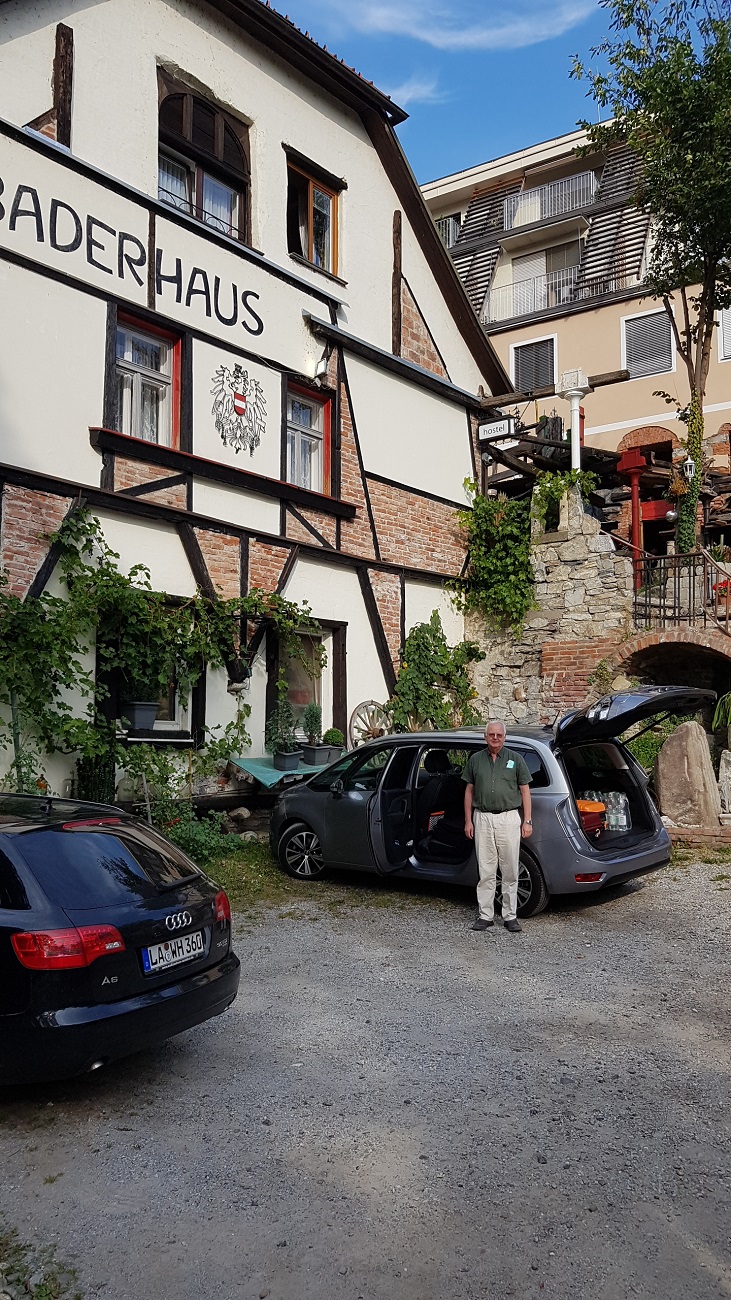 Um 7:30 Uhr verlassen Klaus und ich Stuttgart. Klaus begleitet mich auf der gesamten Tour mit meinem Auto. Ohne Staus und mit kurzer Pause kommen wir bereits um 14:45 Uhr in Brunn bei Wien an. Da das Hotel um diese Uhrzeit noch geschlossen ist, fahren wir in die Innenstadt von Wien, wo wir in einem Café am Seitenarm der Donau eine Kaffeepause einlegen. Ca. 17:15 Uhr können wir im Hotel einchecken. Mein Rennrad ist in einem Raum im Hotel sicher eingeschlossen. Das Hotel ist erst drei Jahre alt und befindet sich in einem neuen Industriezentrum. Im Restaurant des Hotels nehmen wir das Abendessen ein.