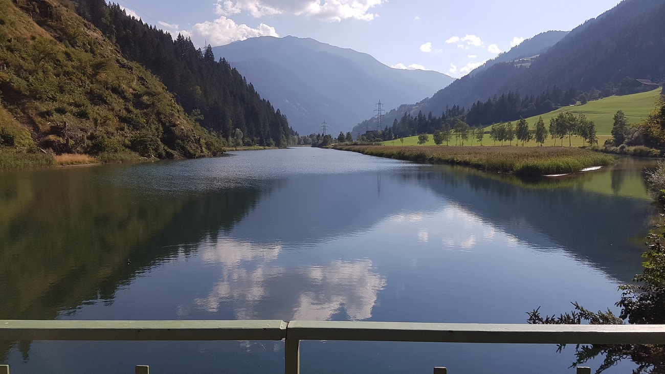 Oben angekommen, sehe ich einen Speichersee. Auf der linken Straßenseite ist ein Café, wo wir uns treffen. Von dort aus sehen wir die Tauern. Vom Gipfel geht es 15 km gemütlich abwärts, ca. 350 Talmeter. Immer wieder sehe ich Gondel- und Sesselbahnen, z. B. in Mitterhof. Die Straße führt entlang des Gerlosbaches. Nach dem Ort Gerlos, Teilort Gmünd, fahre wir wieder an einem Stausee vorbei. In Hainzenberg (1.160 m) beginnen 9 km Abfahrt mit ca. 600 Talmetern. Die Blicke ins Zillertal lassen mich mehrmals stoppen. Nach 42 km erreiche ich Zell am Ziller in Tirol.