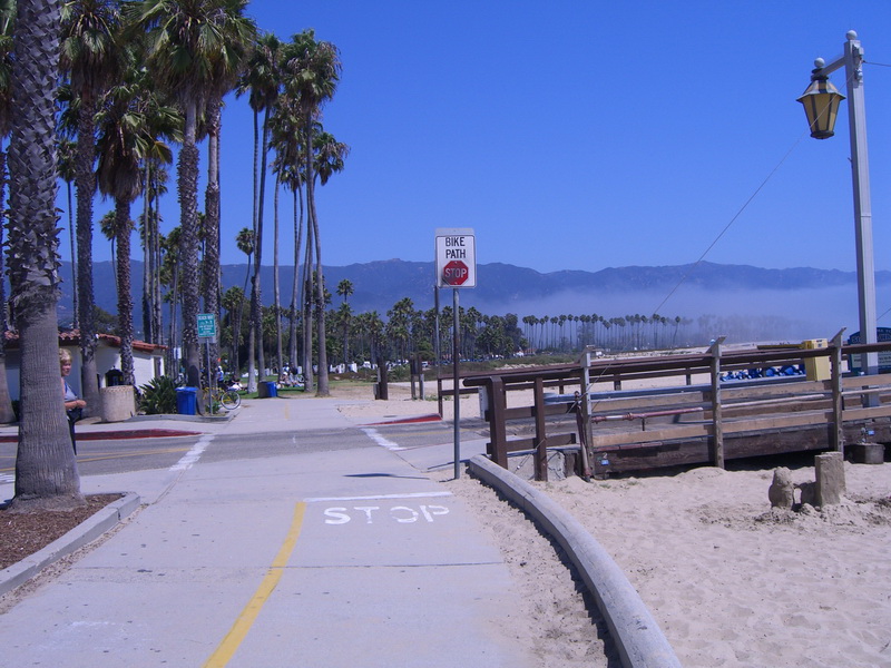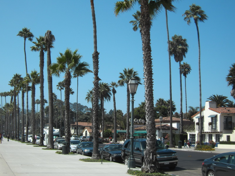 In der Vorbereitung der heutigen Tour ist es uns sehr wichtig, dass wir auf keinen Fall auf einen Highway kommen, den wir mit dem Fahrrad nicht benützen dürfen. Beim Frühstück wird uns von der Hotelleitung versichert, dass die von uns geplante Route für Räder durchweg befahrbar ist. Kaum sind wir auf dem Highway 101 kommt das erste Verbotsschild für Räder! Dies übersehen wir einfach. Als uns nach 2 Meilen ein Polizeifahrzeug passiert, ohne etwas von uns zu wollen, sind wir sehr erleichtert. Unser Start um 8.15 Uhr führt uns durch die von der Morgensonne angestrahlten Santa Ynez Berge. Schnell sind wir überm Berg und die Fahrt geht hinunter in Richtung Pazific Coast mit dem Beginn der Santa Barbara Küstenregion. Die Blicke rechts auf die traumhafte Küste und links in eine bezaubernde Bergwelt machen uns das Radeln leicht. Wir sind froh, dass unser Radweg am heutigen Tag sehr häufig vom Highway wegführt. So können wir alles ganz entspannt genießen: Palmengärten, Villen, Surfer, Camper, kilometerlange Strände. Santa Barbara beeindruckt uns mit seinen gepflegten Palmenalleen, Villen und weiten Stränden. Also treffen wir uns mit unseren Frauen an der Beach Road und machen eine Mittagspause.
